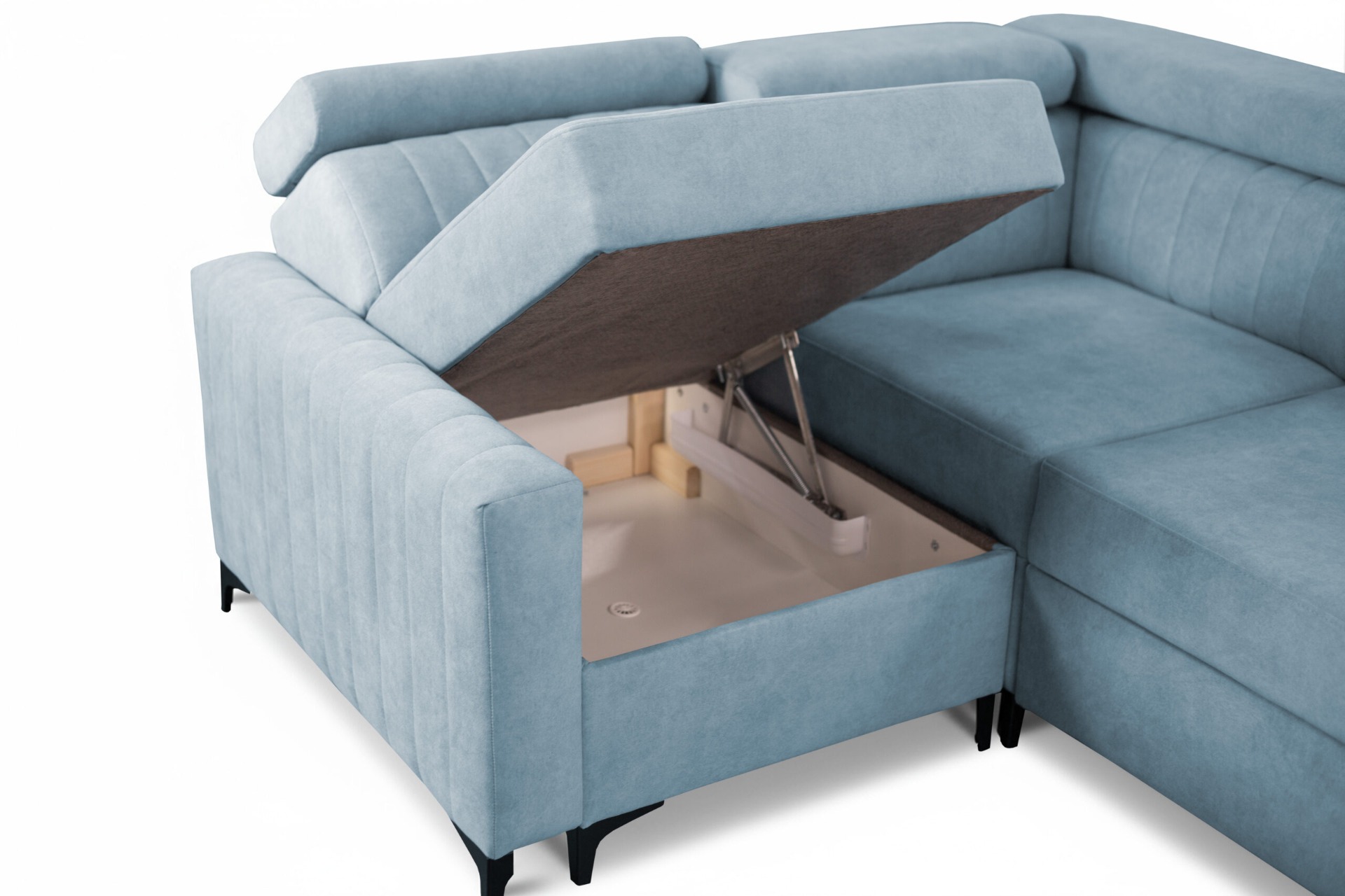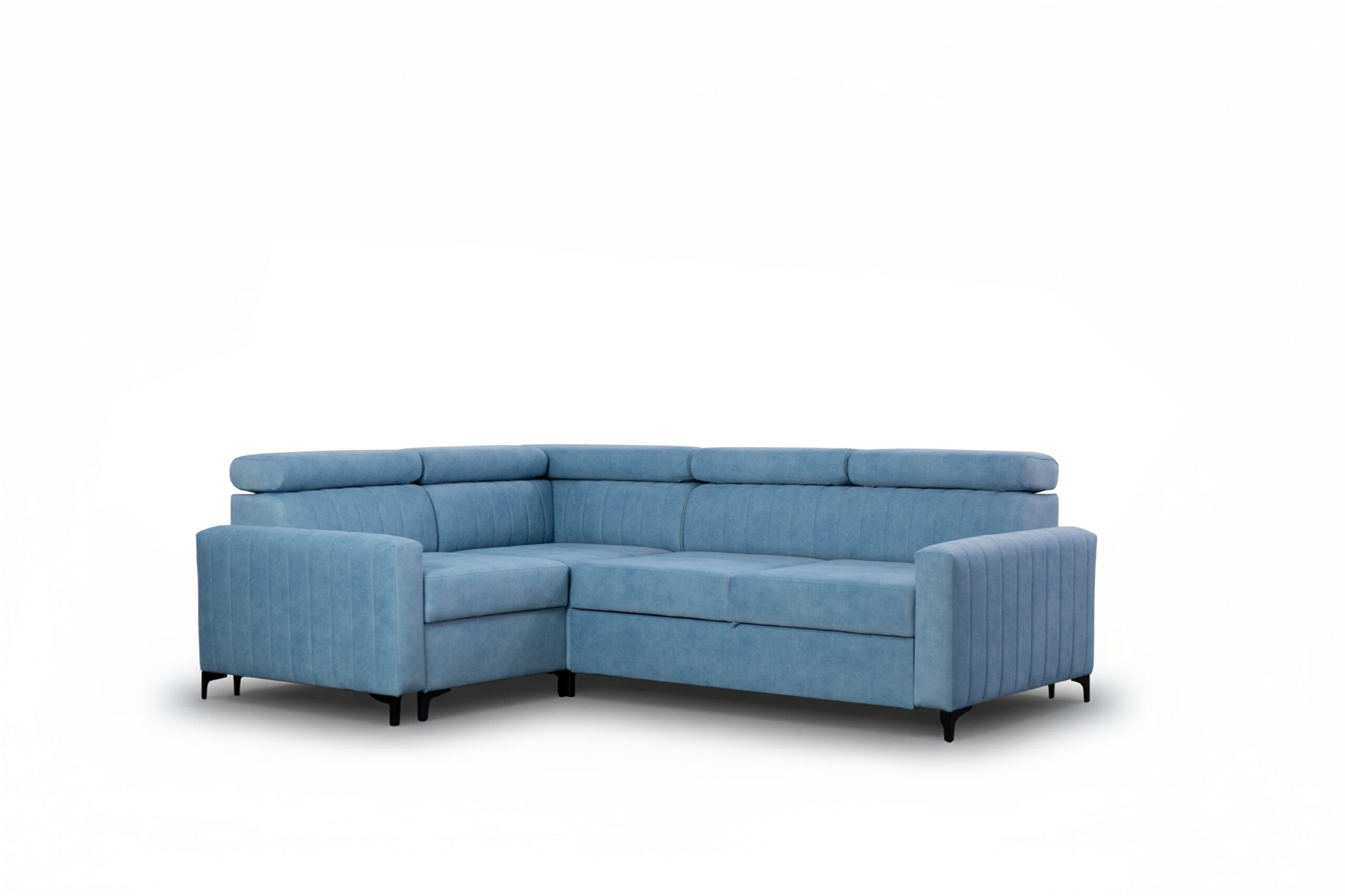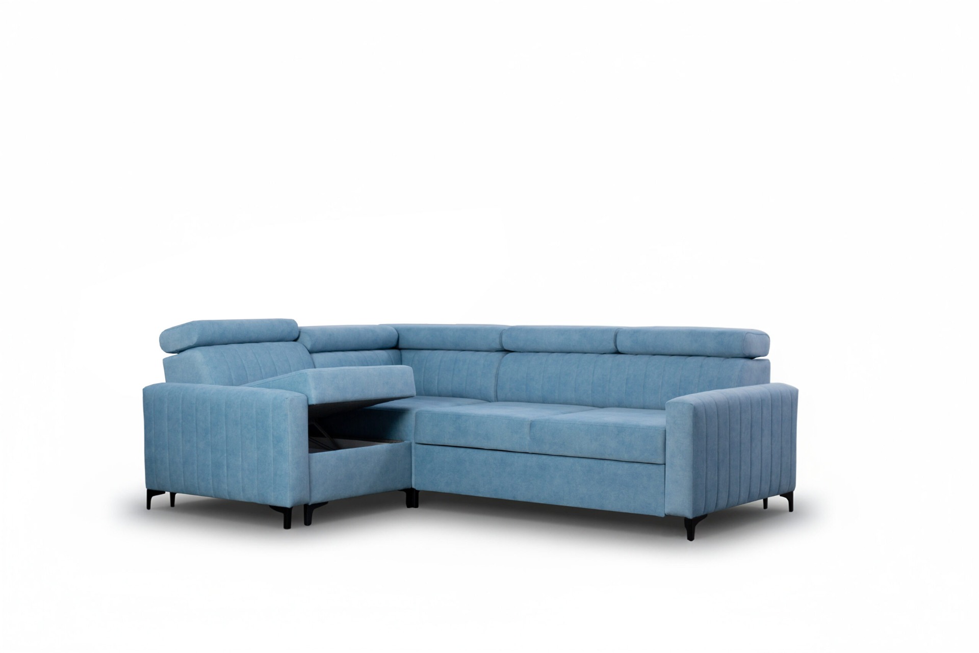 Coffre pour la literie, fonction couchage, pieds métalliques, appuie-têtes réglables – dimensions du canapé d'angle :