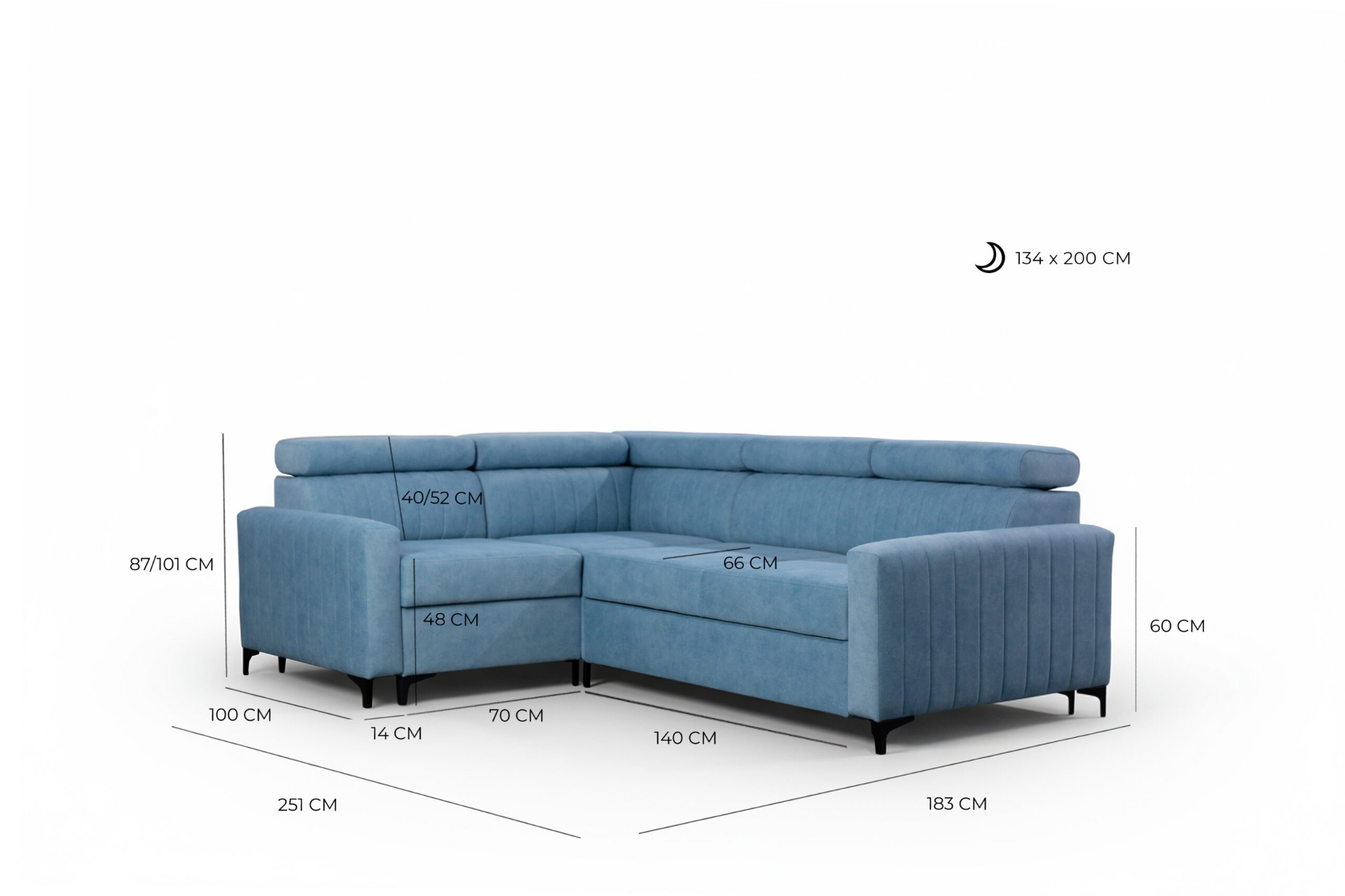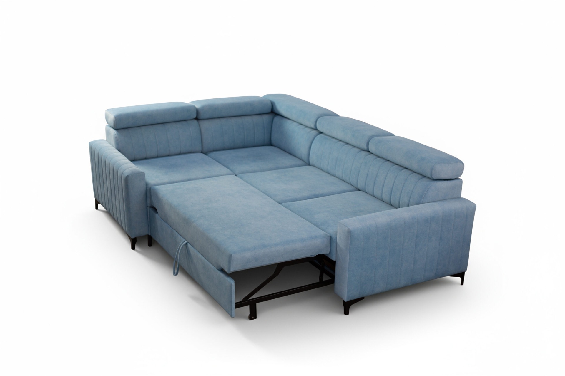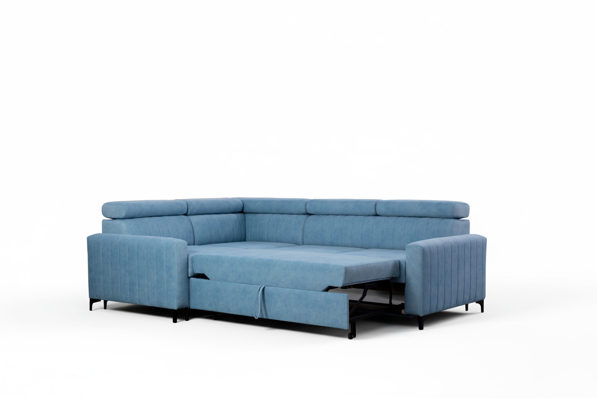 Coffre pour la literie, fonction couchage, pieds métalliques, appuie-têtes réglables – dimensions du canapé d'angle :
