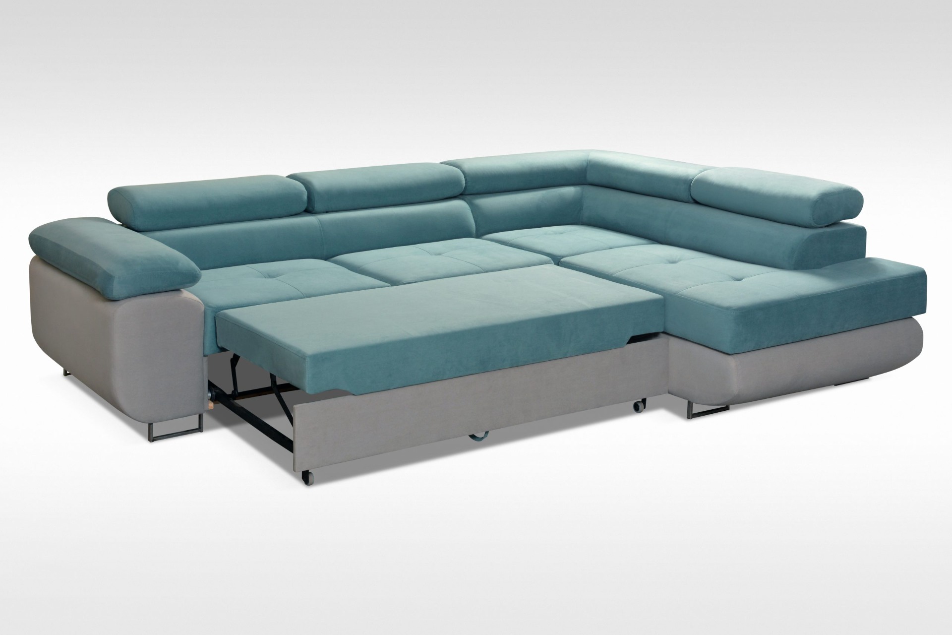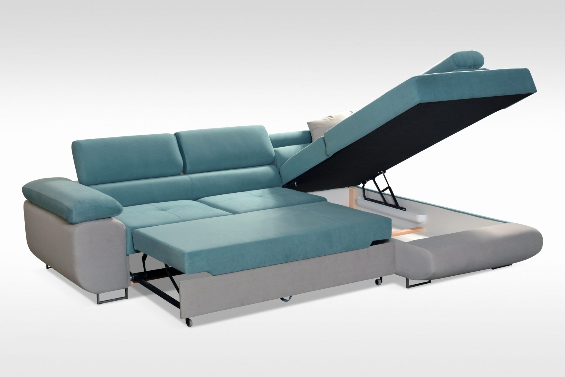 Pieds métalliques, coffre pour la literie, fonction couchage, appuie-têtes réglables – dimensions du canapé d'angle :