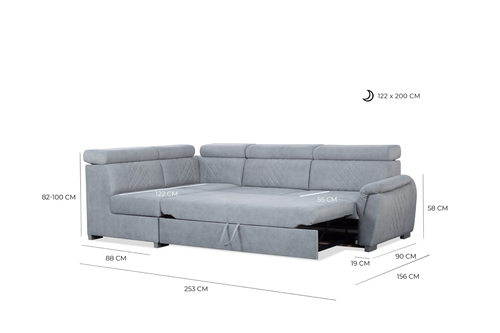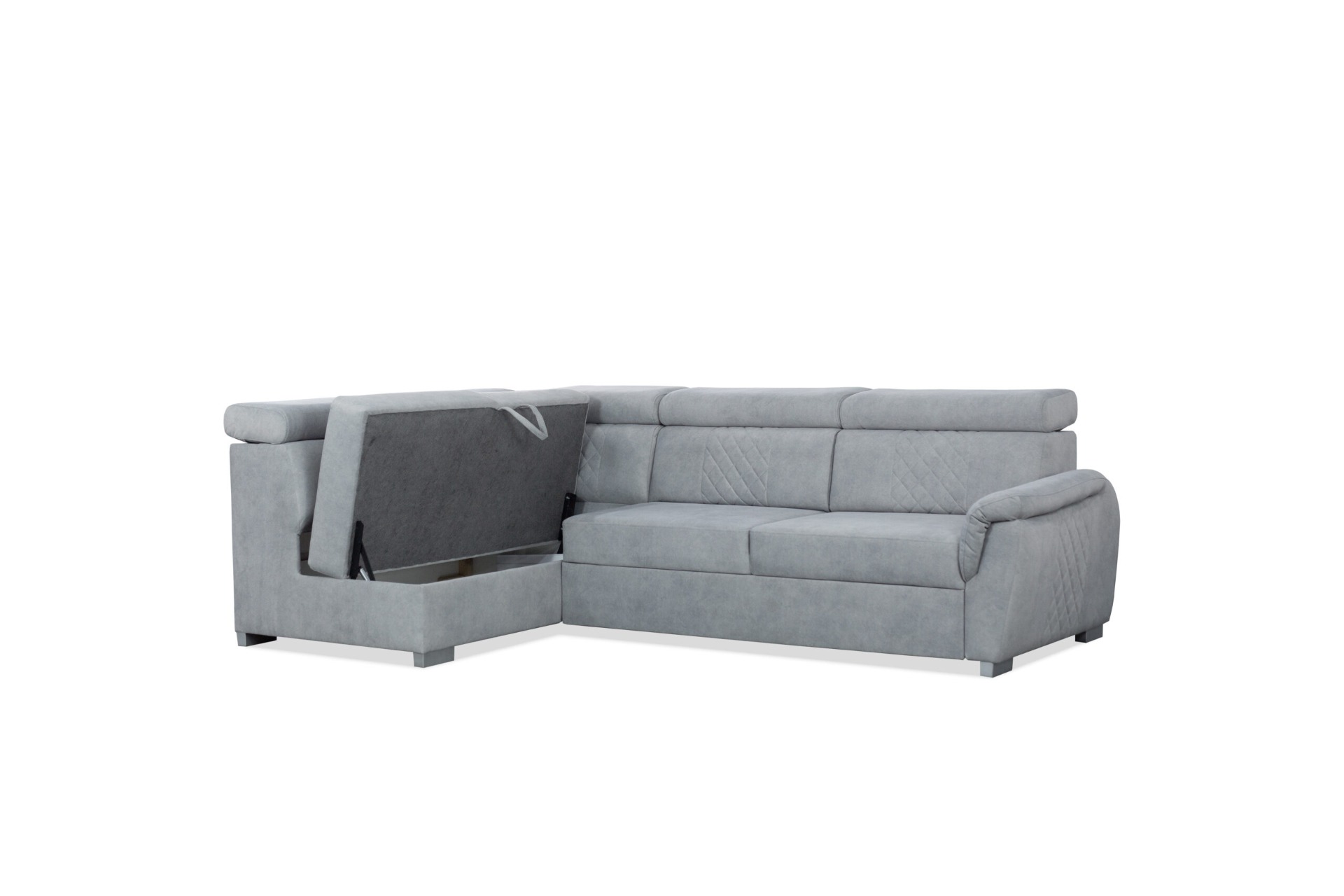 Coffre pour la literie, fonction couchage, appuie-têtes réglables – dimensions du canapé d'angle :