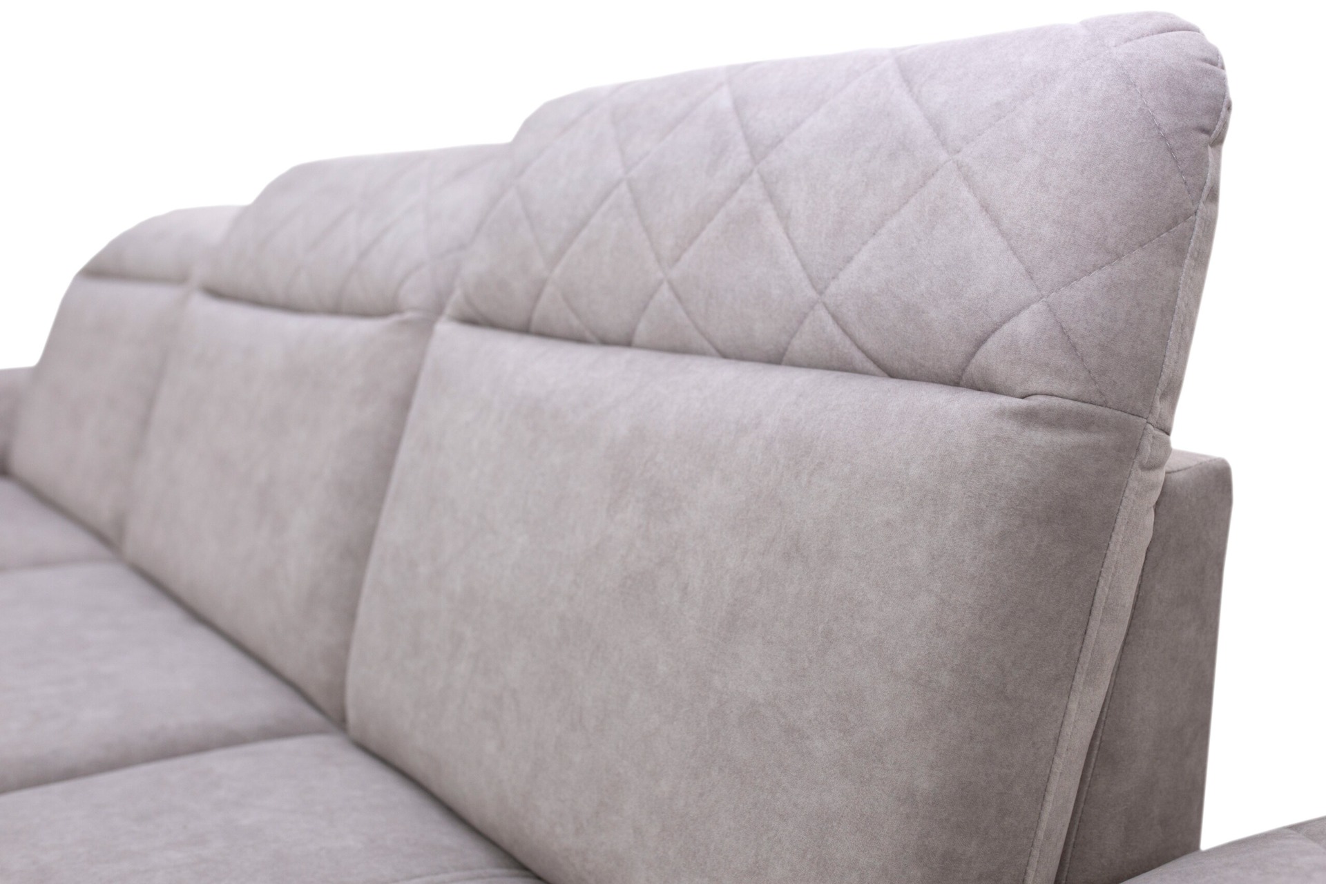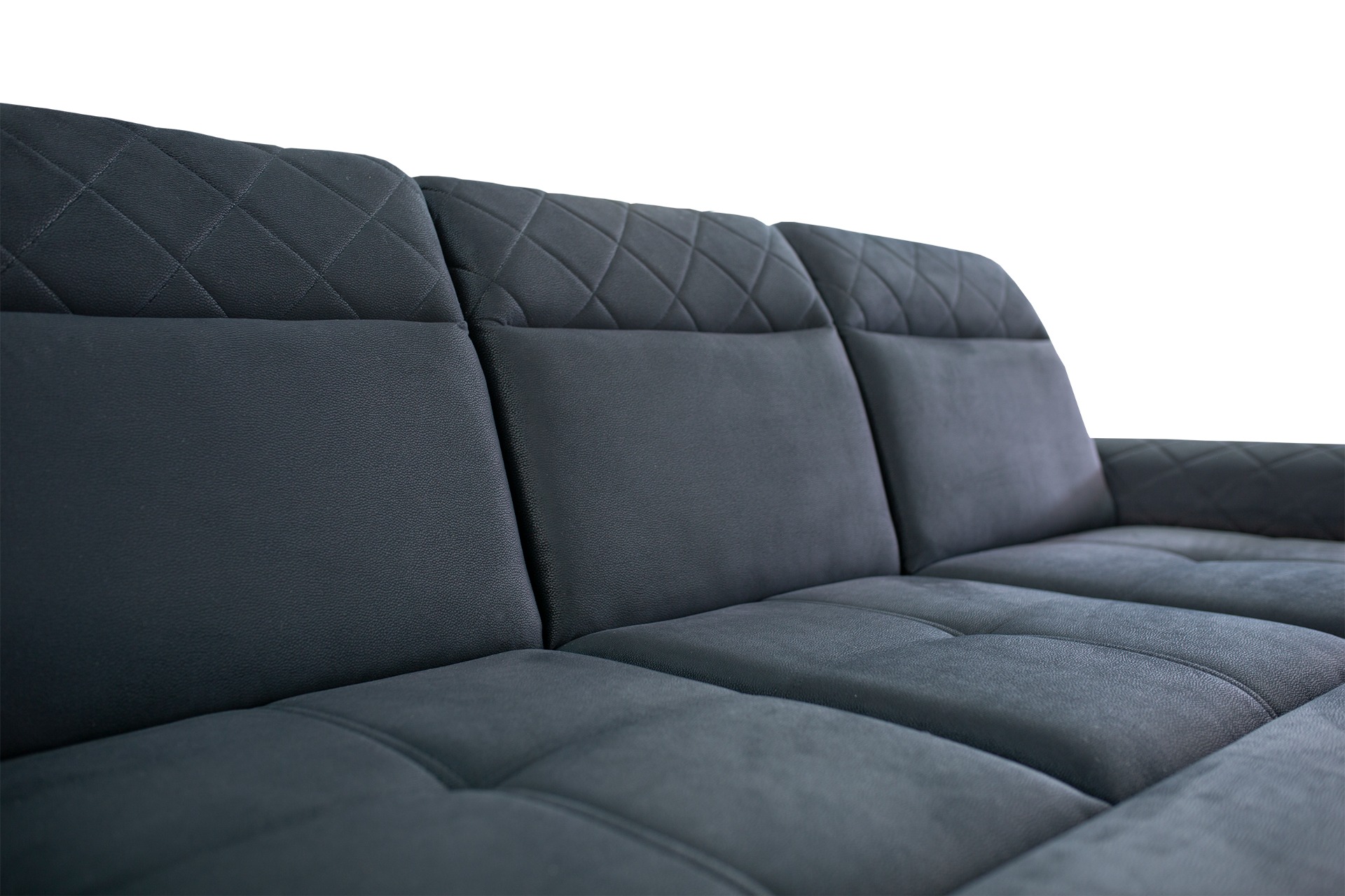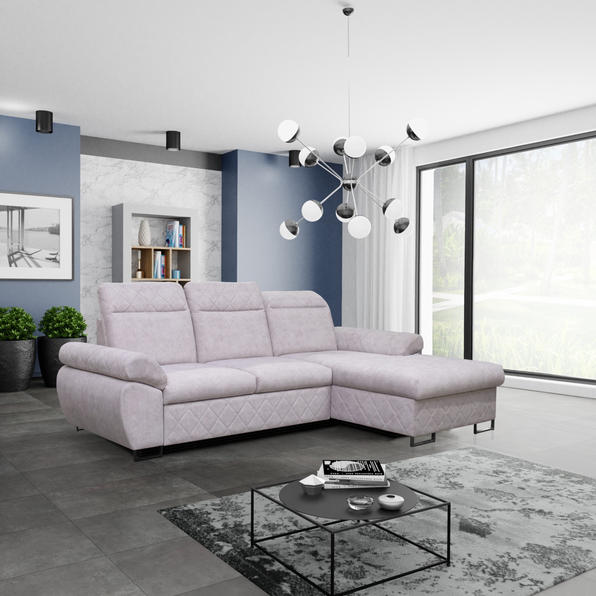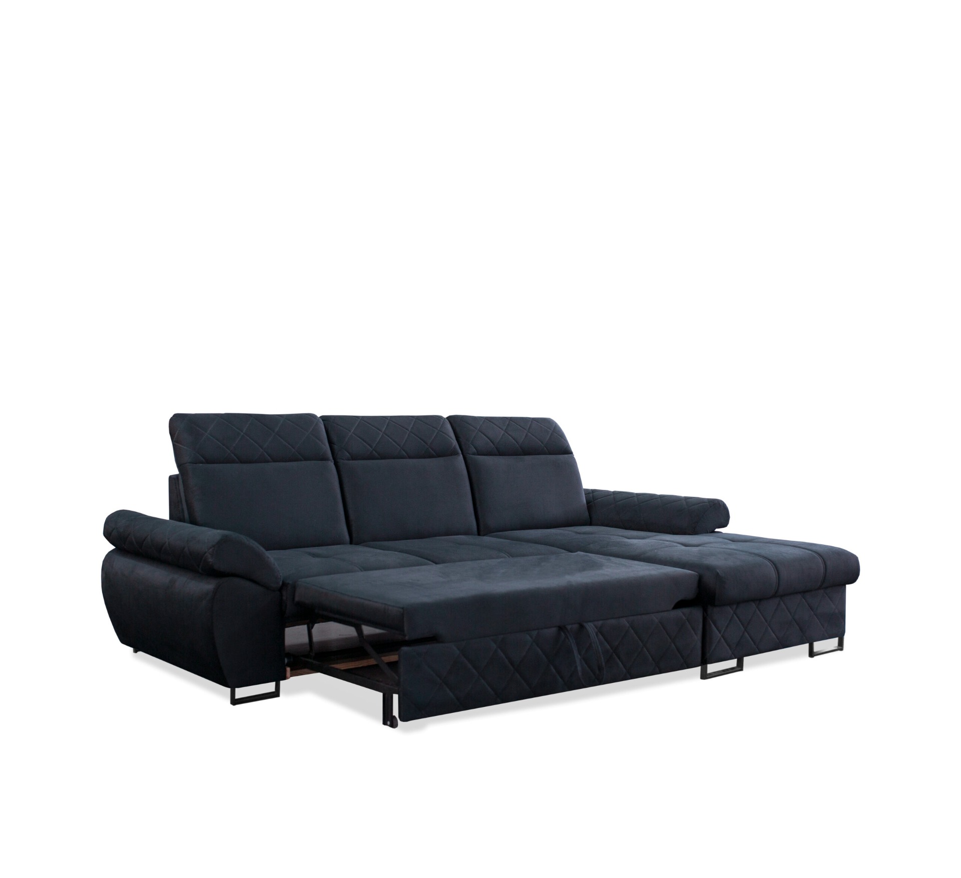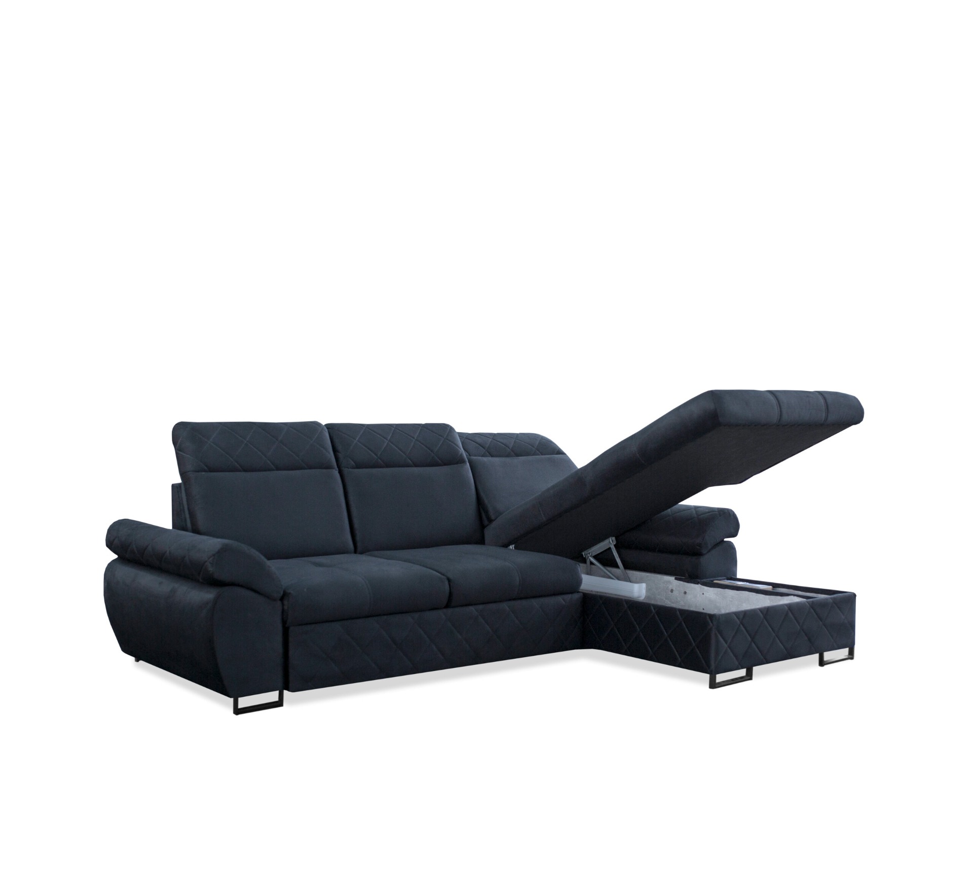 Pieds métalliques, surpiqûres, appuie-têtes réglables, coffre pour la literie, fonction couchage – dimensions du canapé d'angle :